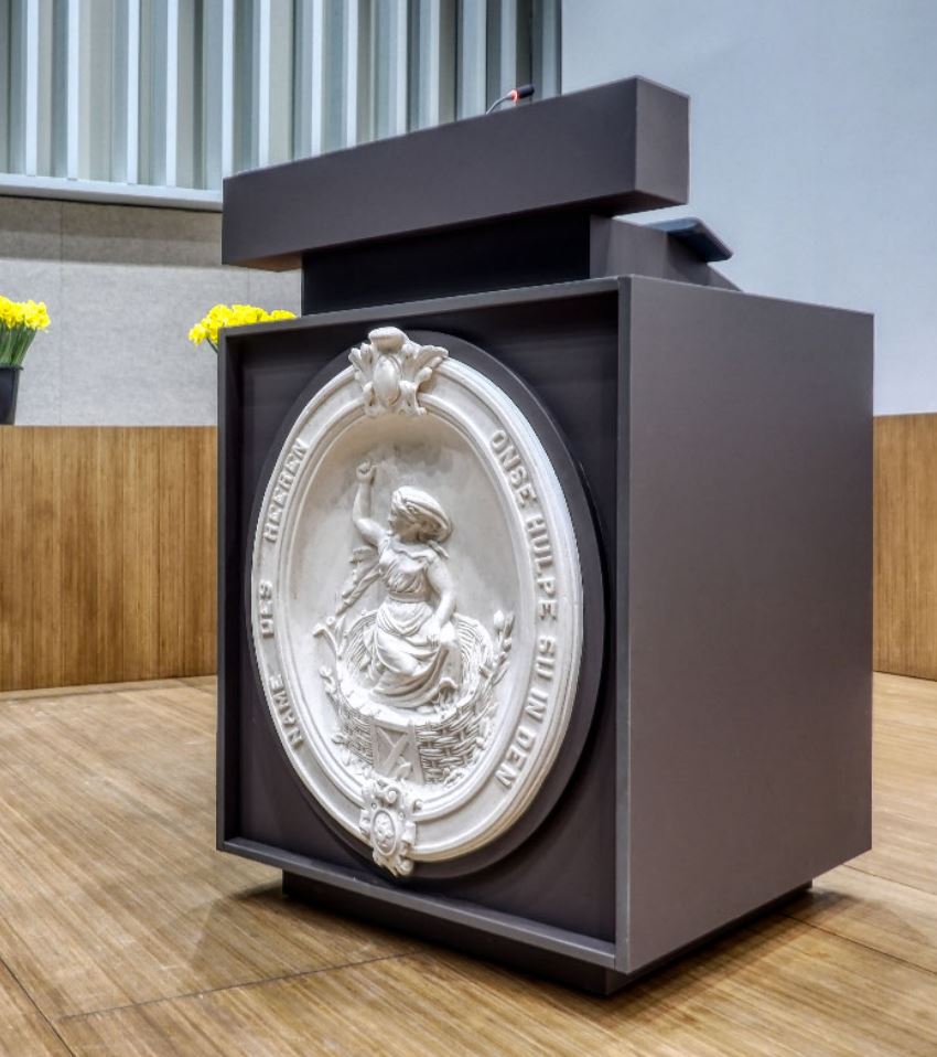 Commissioned by Heddes Construction and Development and designed by OTH Architects, Issos has realized various architectural and interior projects here. For example, we placed the structure in front of the balcony in the back of the room and provided it with the glass partition and upholstery. Wall coverings, paneling, rear walls and custom table tops were also produced and installed. The custom lectern is decorated with a two-component mortar shield with the “VU virgin” specially made by Issos. This shield is a gift from the contractor and Issos to the VU.