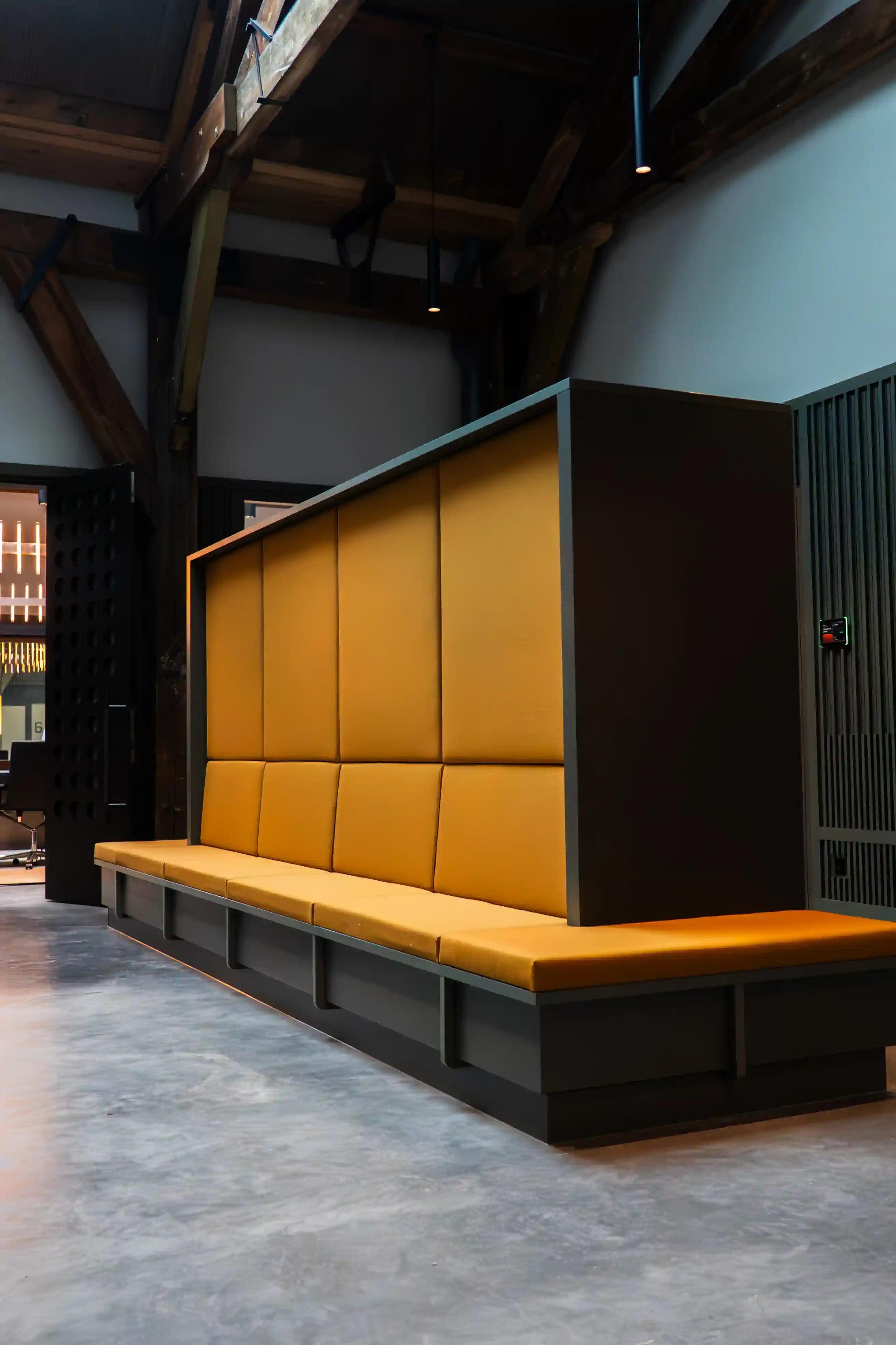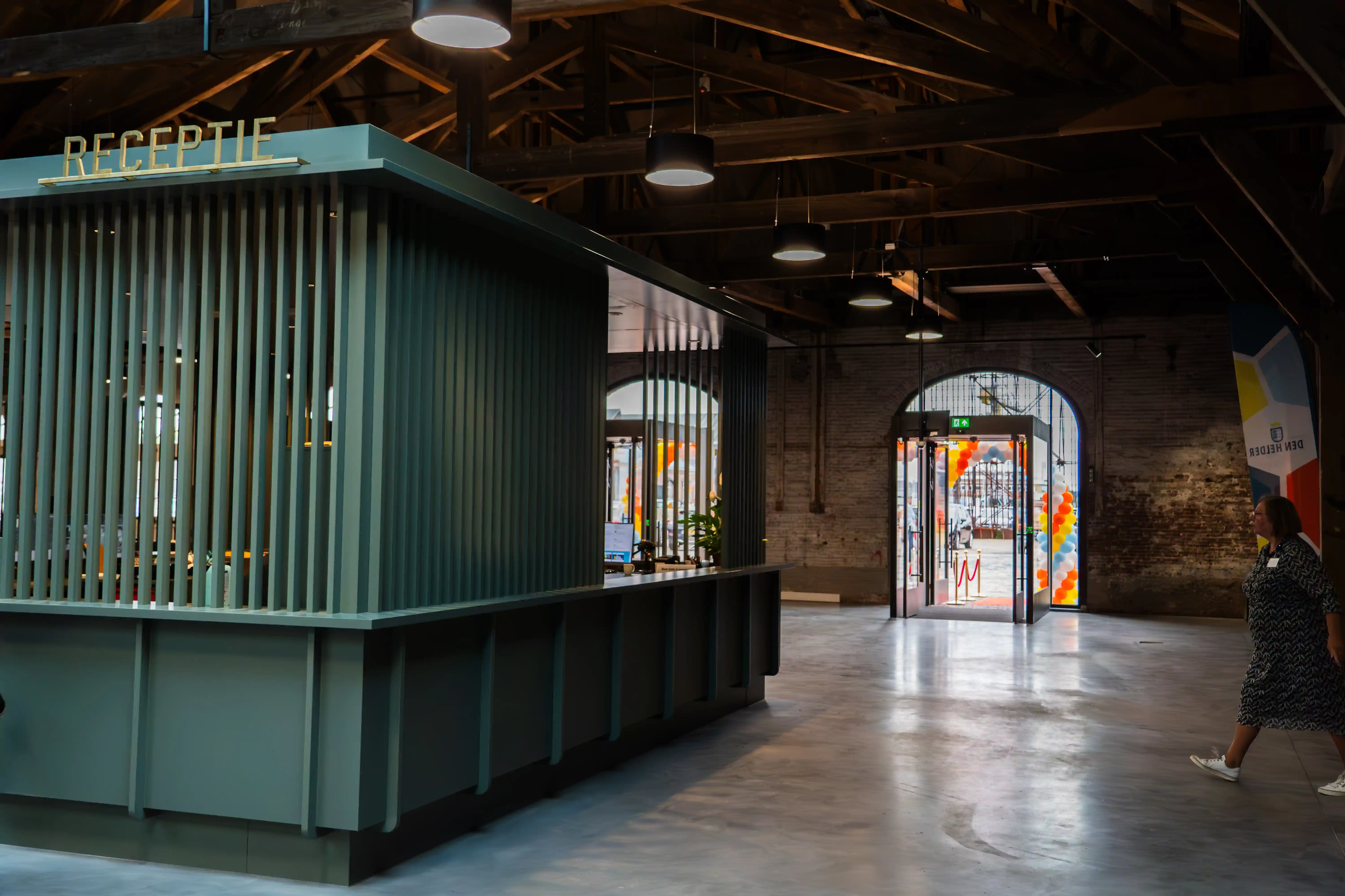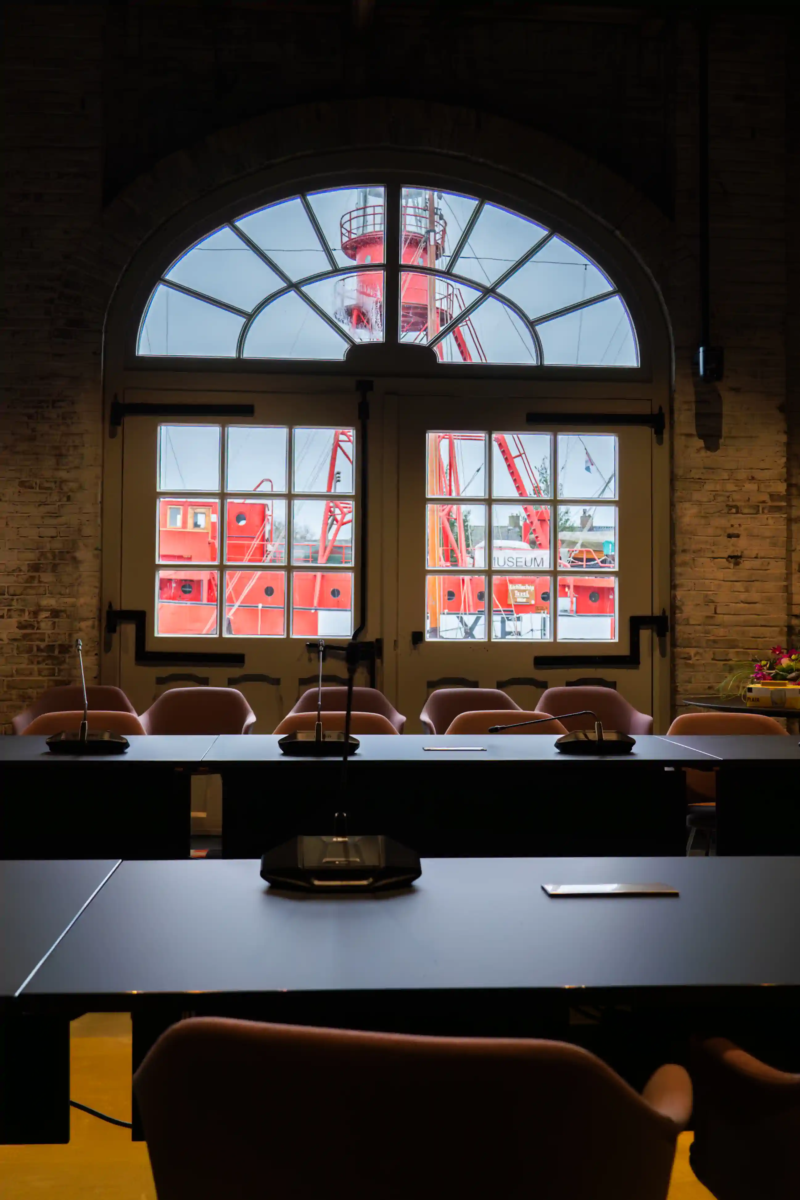 Gebouw 66, een monumentale mastenloods uit 1826, heeft dankzij Issos nu een interieur dat zowel de neoclassicistische stijl respecteert als moderne flair toevoegt. Het hart van dit gebouw, de centrale hal, wordt nu gedomineerd door een opvallende receptiebalie die naadloos past bij de historische achtergrond. De raadszaal, met zijn indrukwekkende spanten en open structuur, is een ander hoogtepunt. Centraal hierin staat een op maat gemaakte ovale raadstafel, vakkundig gelast uit staal en afgewerkt om zijn natuurlijke kleur te behouden, wat herinnert aan een droogdok.