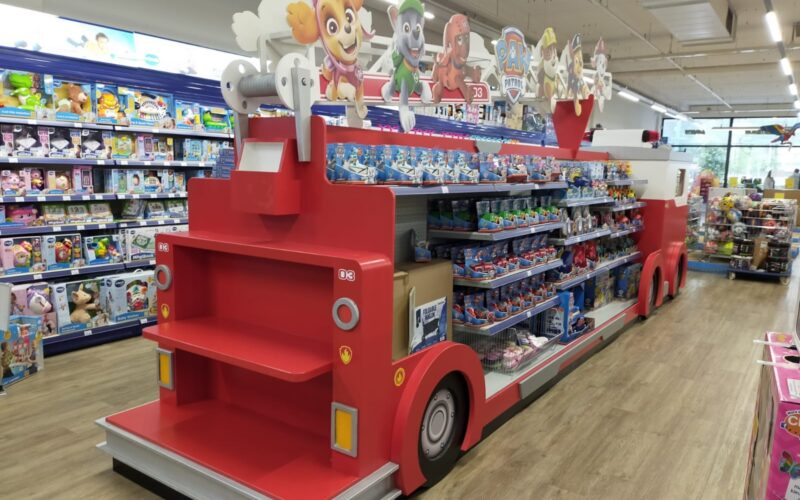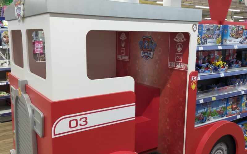 Wij hebben een winkelstelling van 8 m² omgebouwd tot een brandweerauto. Dit maatwerkmeubel hebben wij vervolgens in twee megastores van speelgoedketen ToyChamp geplaatst.Het model is afkomstig uit de Nick jr. serie “PAW Patrol”, uitgezonden op Nickelodeon en Nick jr. Het biedt ruimte aan diverse merchandise en overig speelgoed. De bestuurderscabine is “werkend” en laat kinderen het besturen van de brandweerauto beleven. Ook kunnen daar foto’s gemaakt worden van de “bestuurders”.De diverse onderdelen van het meubel zijn vervaardigd uit MDF. De productie hiervan heeft uiterste precisie vereist. Naast het schilderwerk is ook alle zorg besteed aan de uitvoering van de beeldmerken conform de richtlijnen.Dit “one of a kind” maatwerkmeubel is een echte blikvanger in de ToyChamp megastores geworden. Jong en oud zullen er veel plezier aan beleven.
