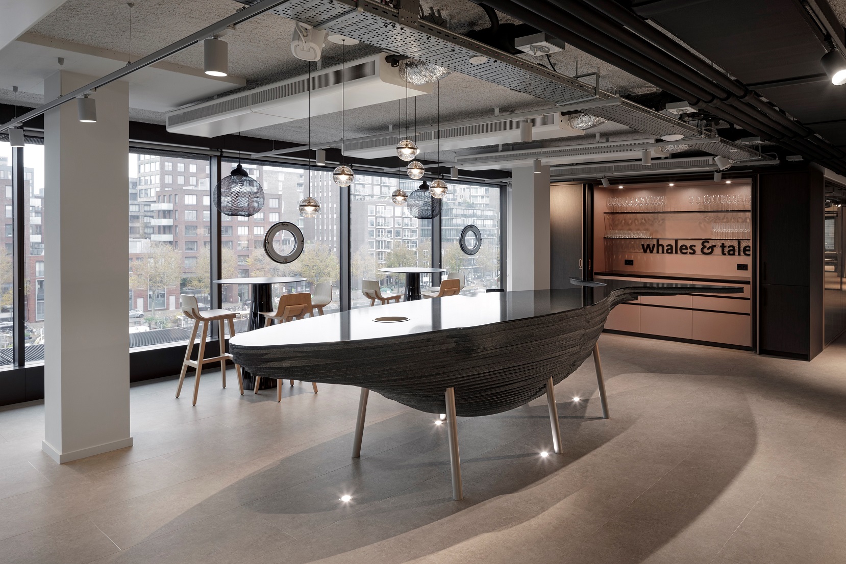 Eyecatcher en technisch hoogstandje in werkcafé Whales & Tales is de Walvisbar. Dit barmeubel, een 3D walvisvorm, bestaat uit composietsteen en diverse lagen in-zee PET vilt. Het is een verwijzing naar de historische locatie en naam van het kantoorgebouw.