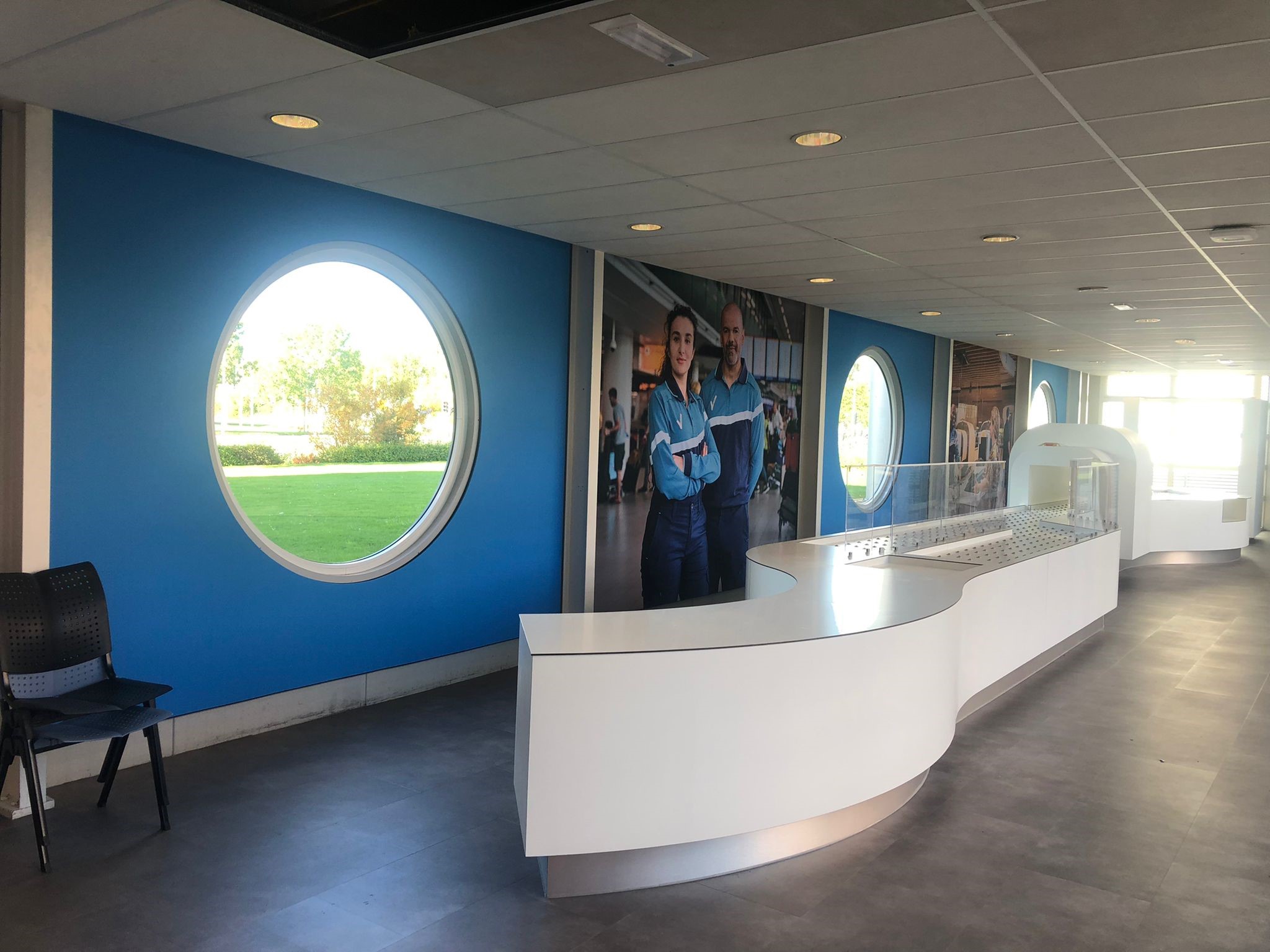 Ook installeerden wij meterslange akoestische wandpanelen parallel aan de mockups, voorzien van luchtvaartindustrie visuals.