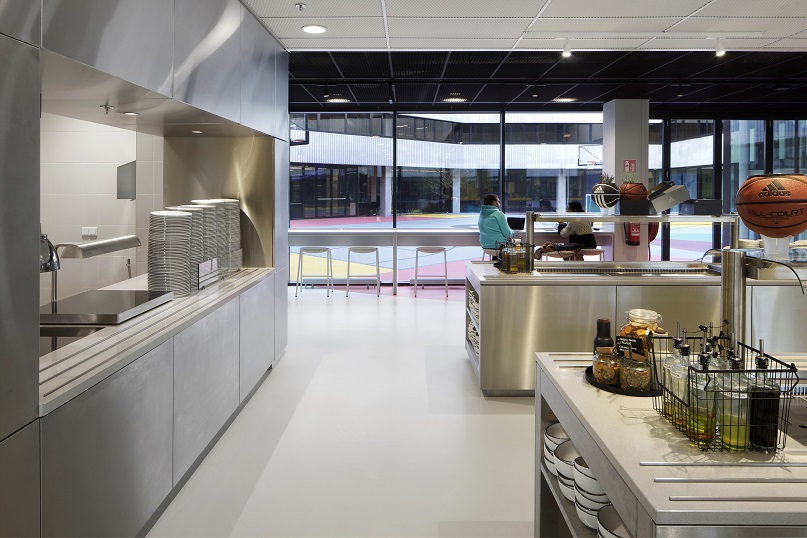 Technisch hoogstandje is een lockerkastmeubel (met ruim 90 lockers) van 11 meter lang. Plantenbakken van strekmetaal dragen bij aan de gewenste sportieve uitstraling.