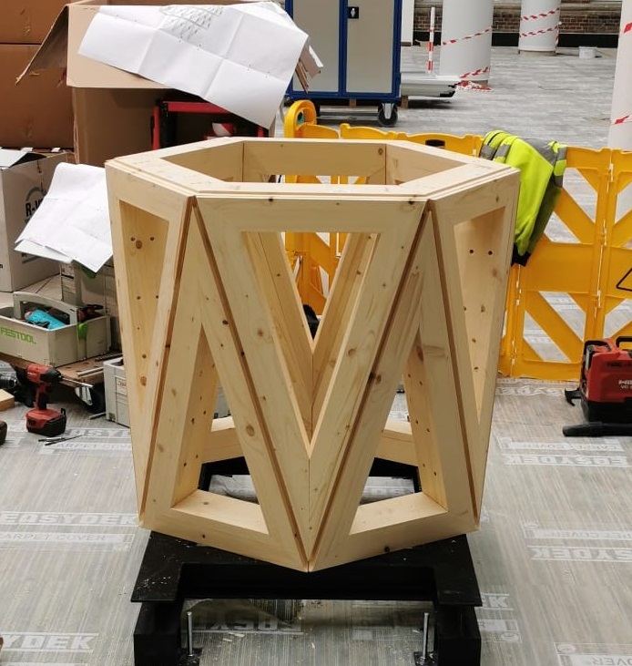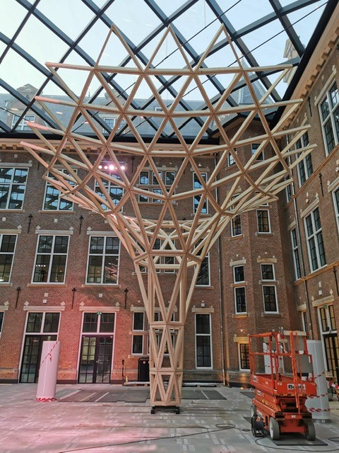 In opdracht van De Vries en Verburg heeft Issos twee houten canopies met zittingen rondom geproduceerd en geïnstalleerd voor dit omvangrijke atrium.