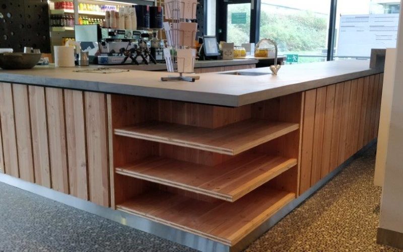 Daarnaast hebben wij hier, in samenspraak met de cateraar, de Espressobar ingericht. Deze bar, waar naast uitstekende koffie diverse gezonde snacks en dito maaltijden verkrijgbaar zijn, is uiterst functioneel opgezet. De look-and-feel is die van het Bankshop 3.0 concept, waarin duurzaamheid en circulariteit van de gebruikte materialen key is. Zo is de centrale bar vervaardigd van FSC gekeurd triple massief Douglas met een micro toppingblad. Bestaande standaard koelelementen zijn verantwoord ingebouwd. Ook is de Espressobar modulair opgebouwd; op ieder moment te demonteren en (deels) te hergebruiken.